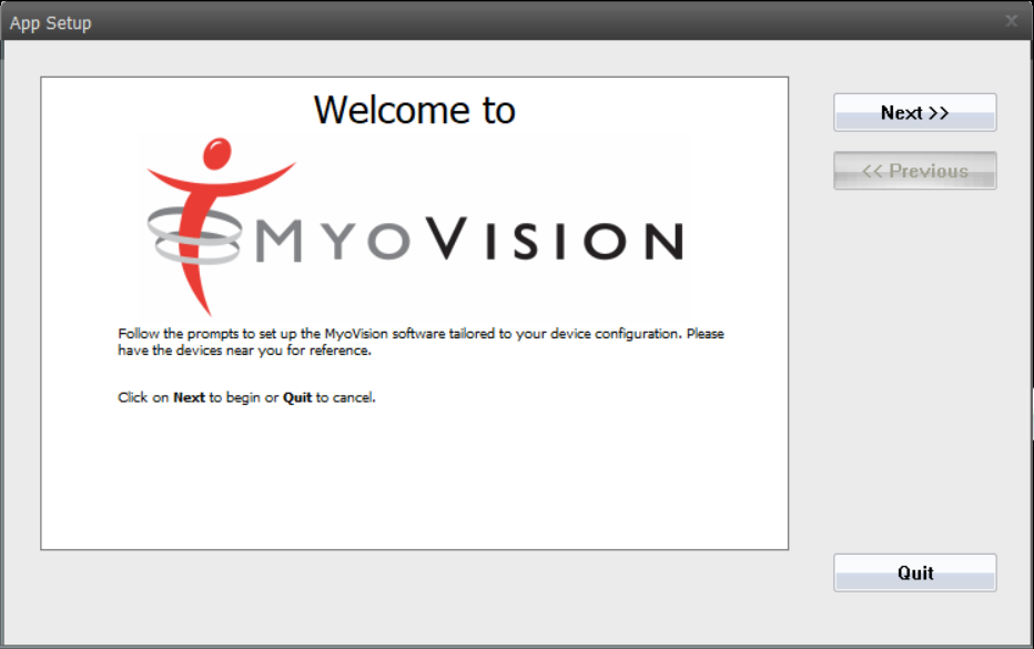 - In the MyoVision Software, go to Help > App Setup. The following window should appear: