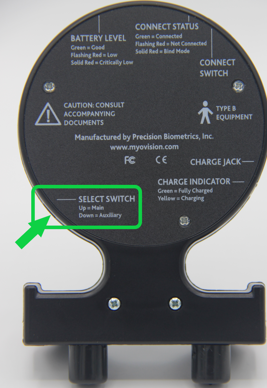 - If the switch is towards the top dome / battery level indicator LED (aka 'Up',) the device is configured for Main