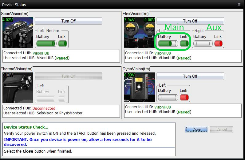 - Press a Red Start Button to turn on the FlexVision and confirm the device shows properly in the Device Status Screen from Step 1