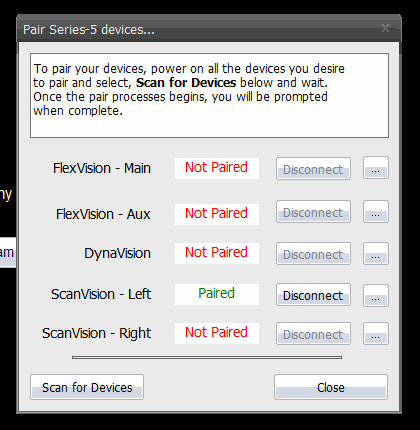 - If not all of the expected devices paired, turn on all the devices again by clicking the start button and click "Scan for Devices." Below is an example of a DynaROM system with a Single ScanVision.